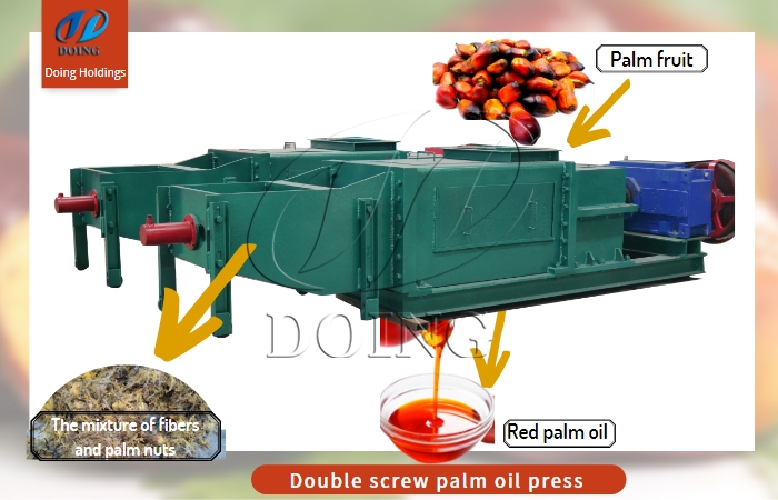 The double screw oil pressing machine has many processing capacities, such as 1tph, 2tph, 5tph, 10tph, 15tph,they are also suitable for home use, small investors or large palm oil pressing production lines. It is relatively automated, easy to operate and has a high oil yield. Its working principle is to use the fixed space of the press cage, with two opposite operation of the press screw in the blast chamber mesh with each other, produce continuous extrusion pressure with the press cage, the oil is squeezed out of the palm fruit. The design of double screw palm oil expeller structure can obtain more powerful extrusion pressure, so that the oil is pressed more thoroughly, and the oil yield is high.