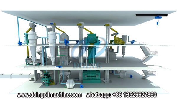 Due to high content of residue in crude oil, it is necessary to separate oil residue by oil drag conveyor firstly, crude oil then enters to settling tank for further separation. Collected residue is returned to pressing section while crude oil from settling tank is pumped to horizontal screw centrifuge or leaf filter for further removing impurities.