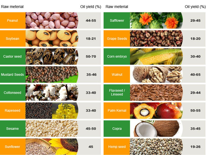 Our big capacity oil press machines are suitable for extracting various vegetable oil seeds and nuts for edible purpose . For example, our big capacity oil press machine can process soybeans, canola/ rapeseed, palm kernels, groundnuts, sunflower seeds, castor bean, maize, rice bran, tea seed, safflower seed and so on.We generally put these big oil press machines into cooking oil production factory.